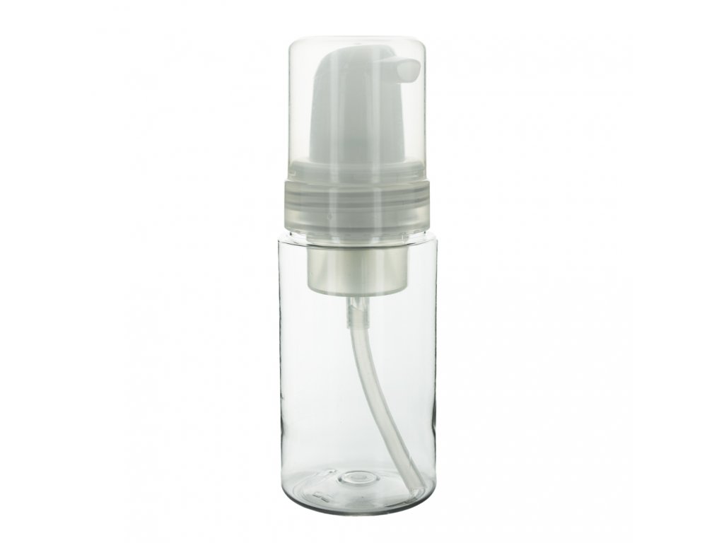 Láhev, 42 mm hrdlo, 100 ml, transparentní, PET + Zpěňovací pumpa, bílý aktuátor, s transp. víkem